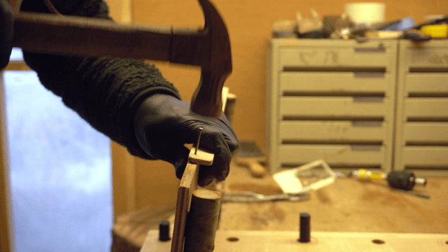 공방에서 금속을 구부리기 위해 망치질을 하는 사람