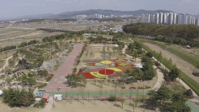 아파트 앞의 화창한 날씨를 즐길 수 있는 호수 공원