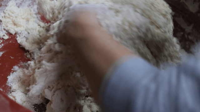큰 그릇에서 반죽을 치대는 손