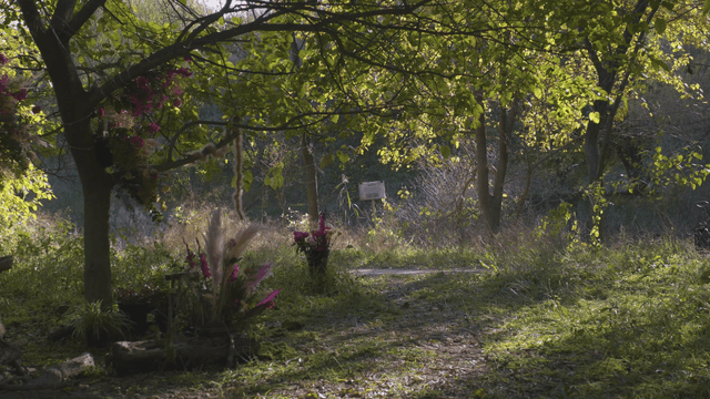 나무 사이로 햇빛이 비치는 조용한 숲길