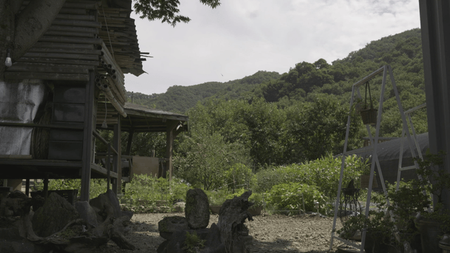 다채로운 꽃으로 둘러싸인 나무 오두막
