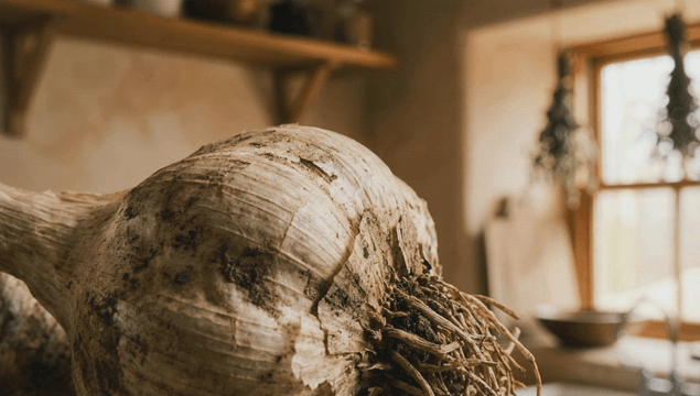 소박한 주방 테이블 위의 큰 마늘