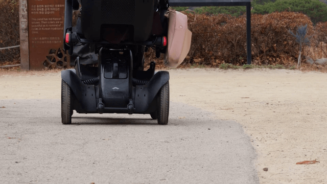 나무가 늘어선 길을 걷는 휠체어 탄 사람의 뒷모습