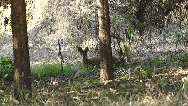햇살이 비치는 숲에서 풀을 뜯는 고라니