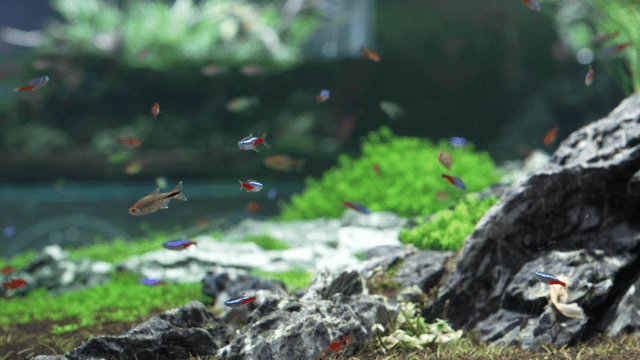 수족관 바닥에서 먹이를 먹는 작은 물고기들