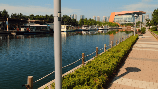 맑은 물이 흐르는 강변 산책로