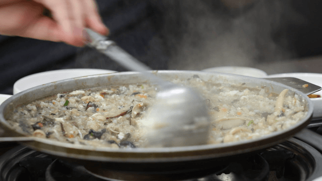 뜨거운 팬에서 지글거리는 부대볶음을 퍼내는 국자