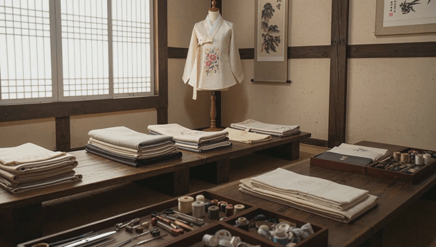 잘 정리된 전통 한복과 정갈히 놓인 바느질 도구