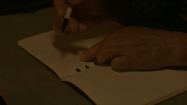 어두운 방에서 노트를 쓰는 사람