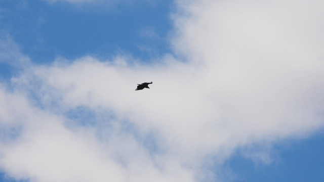 흰 구름이 덮힌 하늘을 나는 새 떼