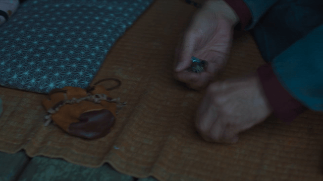 어두운 방에서 무릎 위에 손을 얹고 있는 노인