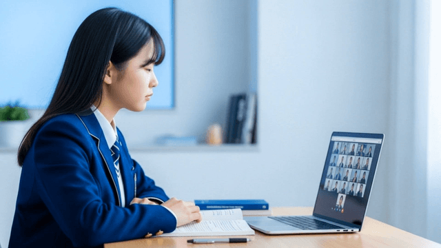 교실에서 교사의 말을 주의 깊게 듣는 교복 입은 학생들