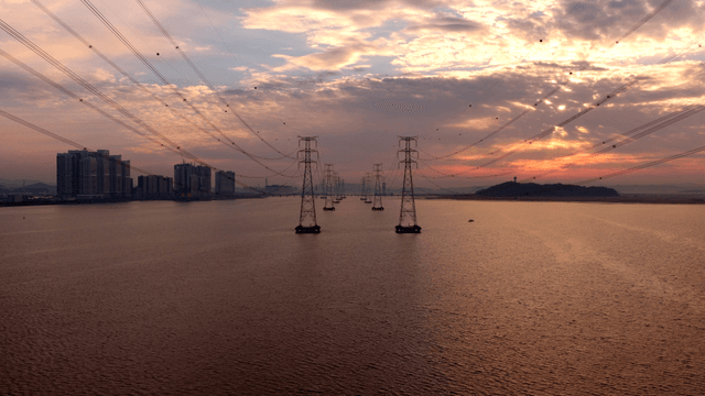 강 위 일몰을 배경으로 이어진 송전탑 전선