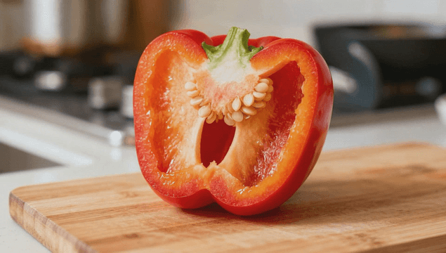 나무 도마 위에서 화려한 피망을 잘게 써는 장면