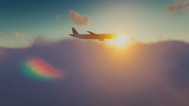활주로 불빛과 함께 일몰에 착륙하는 비행기