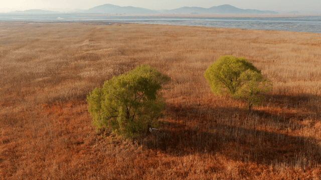 광활한 습지 갈대 들판에 놓인 나무 두 그루