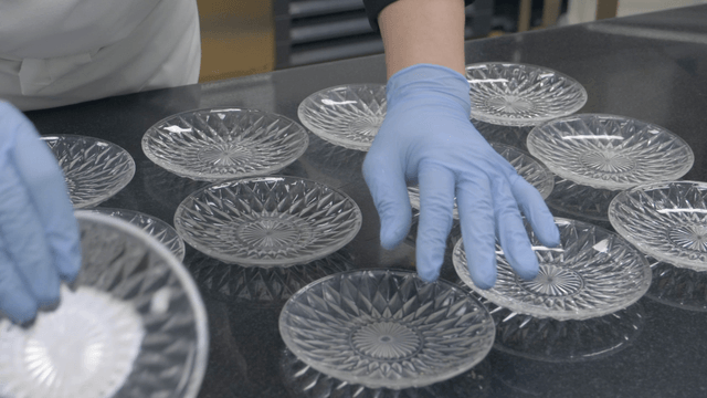 장갑 낀 손으로 몰드에 디저트 준비