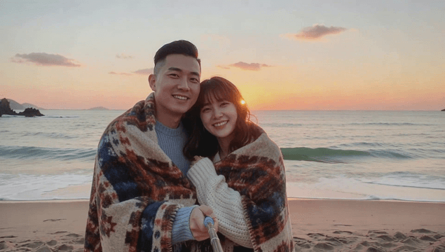 해변에서 일출을 즐기는 커플