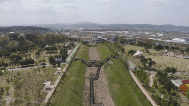 놀이터와 산책로가 있는 공원의 항공 뷰