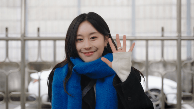 파란 목도리를 한 여성이 정면을 보고 미소 짓는 모습