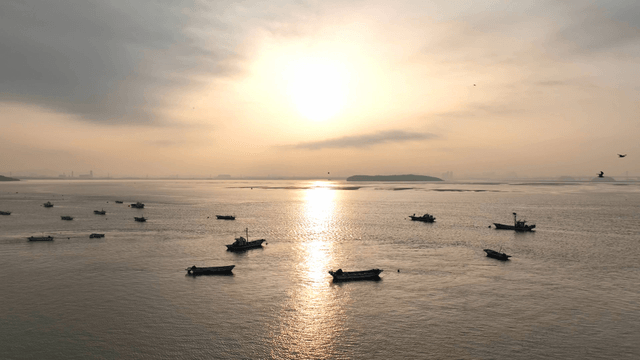멀리 배가 보이는 고요한 바다의 일몰 풍경