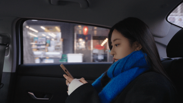 택시 안에서 휴대폰을 보는 여성