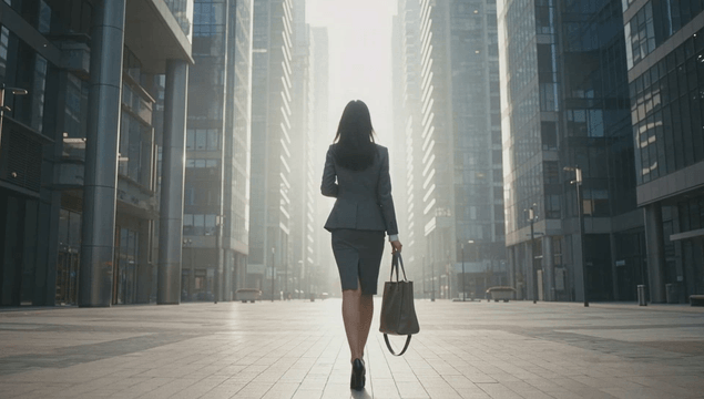 현대 도시 풍경 속을 걷는 여성 회사원의 뒷모습