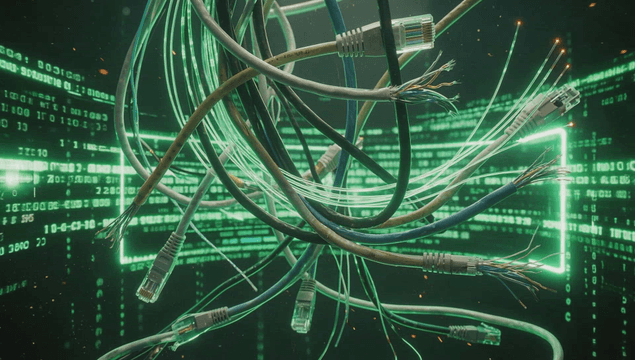 디지털 코드와 얽힌 네트워크 케이블
