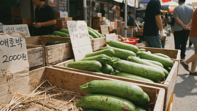 탁자 위 바구니에 쌓인 신선한 녹색 애호박