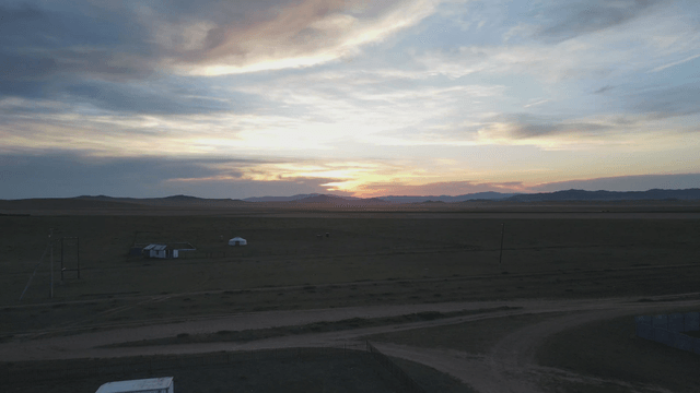산과 함께 펼쳐진 광활한 풍경의 일몰
