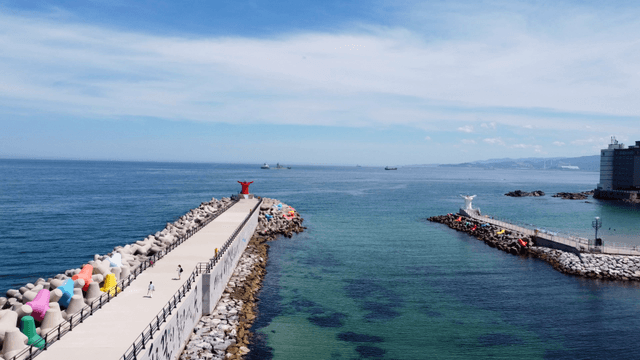 멀리에 긴 방파제가 보이는 잔잔한 바다