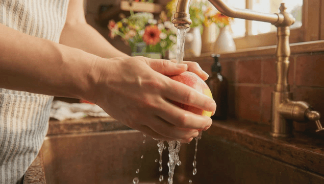 주방에서 흐르는 물에 큰 생고기 조각을 씻는 사람