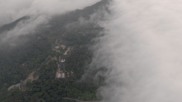 멀리 한옥이 보이는 안개 낀 산 풍경