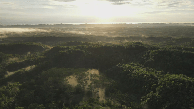안개 낀 숲의 일출 풍경