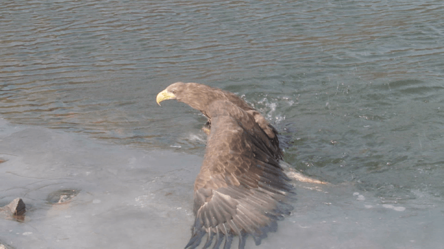 얼음 낀 물속에서 물고기를 잡아 올리는 독수리