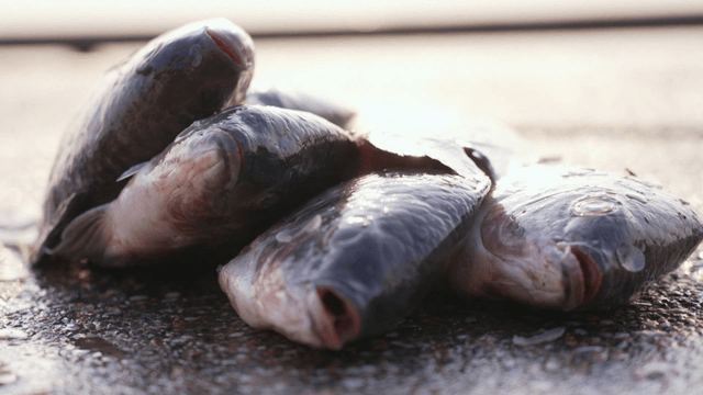 화창한 날 파란 방수포 위에 널린 갓 잡은 물고기들