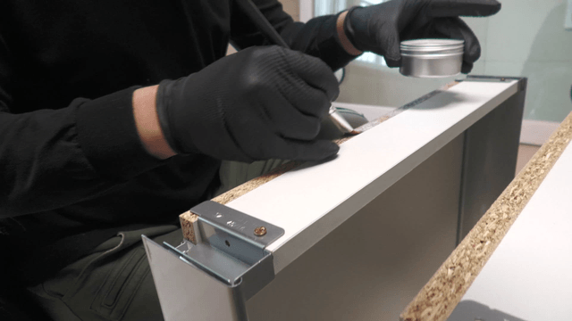 목공예가가 나무 판에 마감재를 바르는 모습