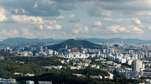낮부터 저녁까지의 대도시 서울의 전경과 하늘
