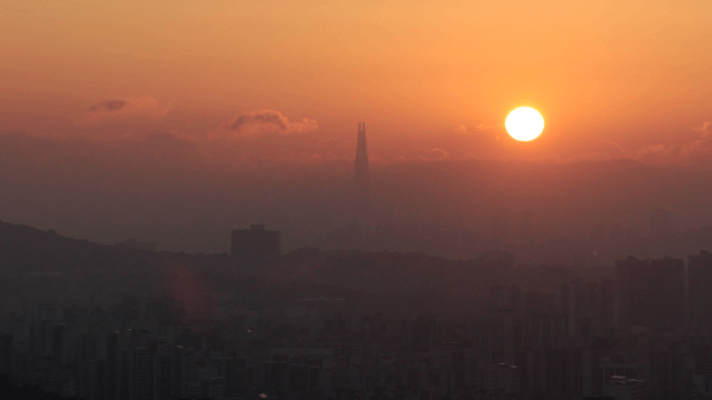 번화한 도시의 스카이라인과 붉은 노을이 어우러진 전경