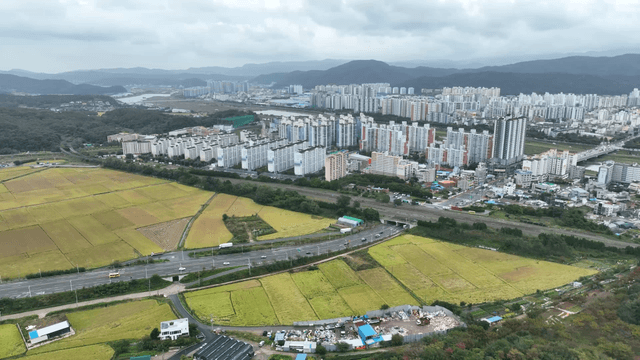 가지런한 사각형 모양으로 나뉜 농경지의 전망