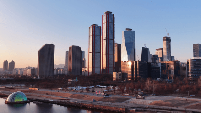 강을 따라 펼쳐진 고층 빌딩의 도시 전경