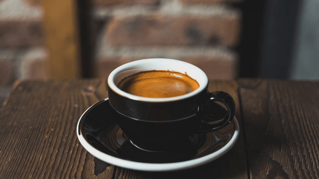 나무 테이블 위의 에스프레소 한 잔