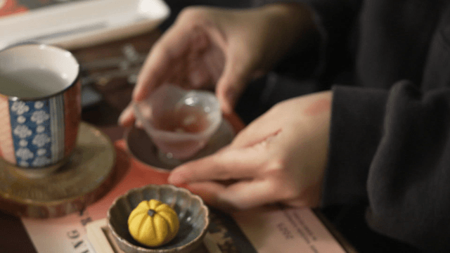 작은 컵에 차를 따르는 모습