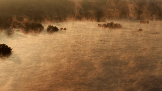 안개 낀 강 위의 일출