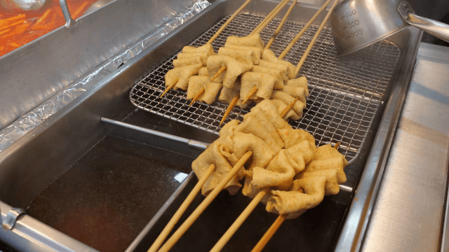 냄비에 김을 내며 담겨진 어묵 꼬치