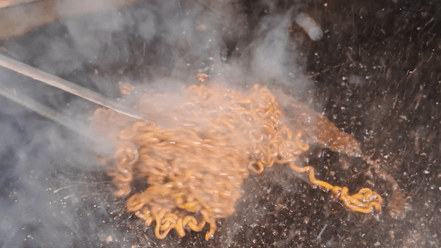 팬에서 불꽃과 함께 면을 볶는 장면