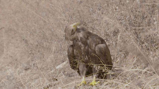 물가의 마른 갈대 사이에 쉬고 있는 독수리