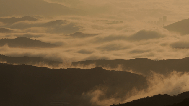 짙은 안개에 덮인 웅장하고 울창한 푸른 산맥