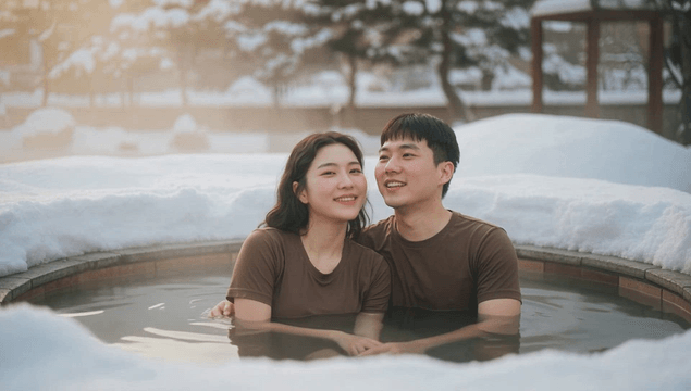 눈 덮인 산을 배경으로 온천에서 휴식을 취하는 커플