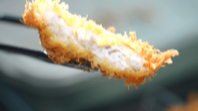튀김기에서 튀겨진 바삭한 돈가스를 집게로 건져내기